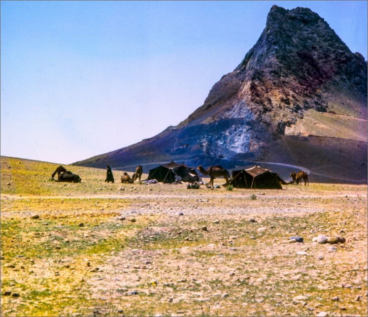 A small camp of Kuchi, itinerant nomads, often seen along the roads in Afghanistan in those days, during the drive between the 3 large cities (Herat, Kandahar and Kabul) which is the connection between Iran and Pakistan. The country itself was a vast arid place, with few large gatherings of people, except for the cities. The single road, in those days, was controlled by local overlords and ‘tolls’ had to be paid. But otherwise, the road, half built by American aid and half built by Russian aid, was unobstructed, except for the occasional goat or camel herd.